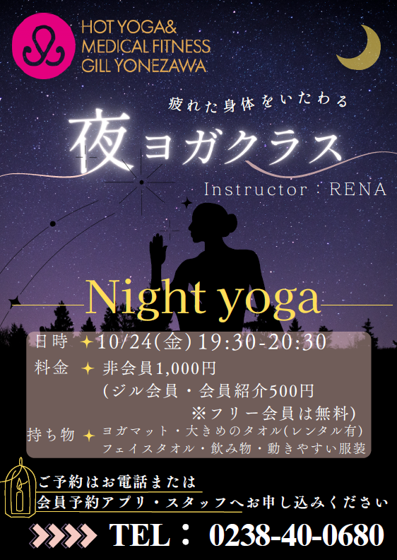 持物:ヨガマット・大きめのタオル・フェイスタオル・飲み物・動きやすい服装を持ってお越しください